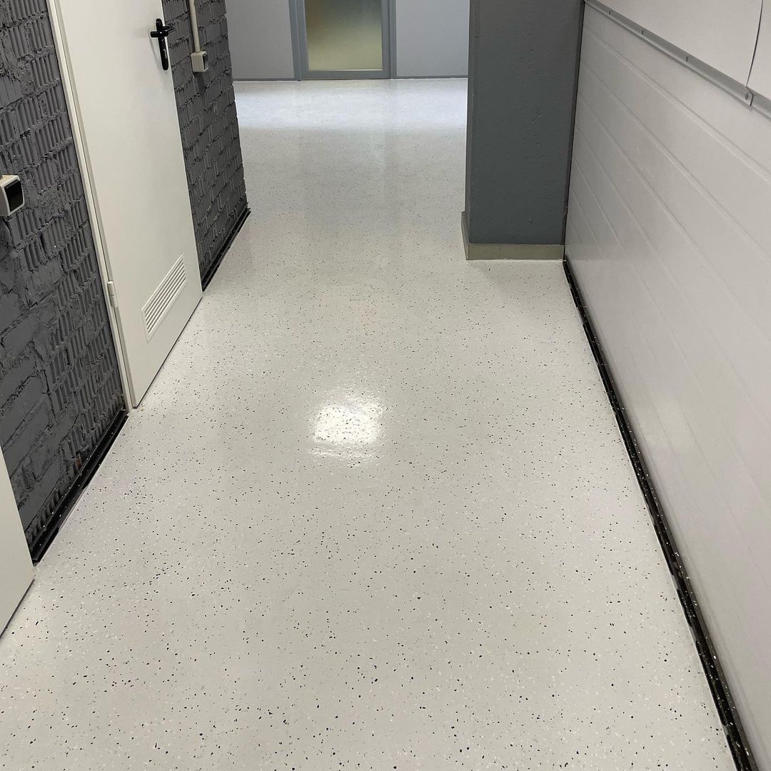 Бригада из 4 человек работала. Предварительная подготовка заняла много времени, надо было демонтировать прошлое половое покрытие, оно уже плесневеть начало, поэтому основание под пол обработали еще и противогрибковым раствором. Мусора после демонтажа было много, мастера его вынесли. Потом отшлифовали поверхность основания, а для лучшей адгезии нанесли грунтовку. Эпоксидный состав разводили в прямо в помещении. Кстати, он подешевле полиуретанового, но мои требования удовлетворяет. Смола легла ровно. Застыла в течении суток. Шлифанули покрытие и нанесли поверх эпоксидного покрытия два слоя полимерного (полиуретанового) лака. Полиуретан намного прочнее, на нем реже появляются царапины. Работы закончили в срок, из-за демонтажа у нас ушла неделя, да и технологии надо было сроки выдерживать.